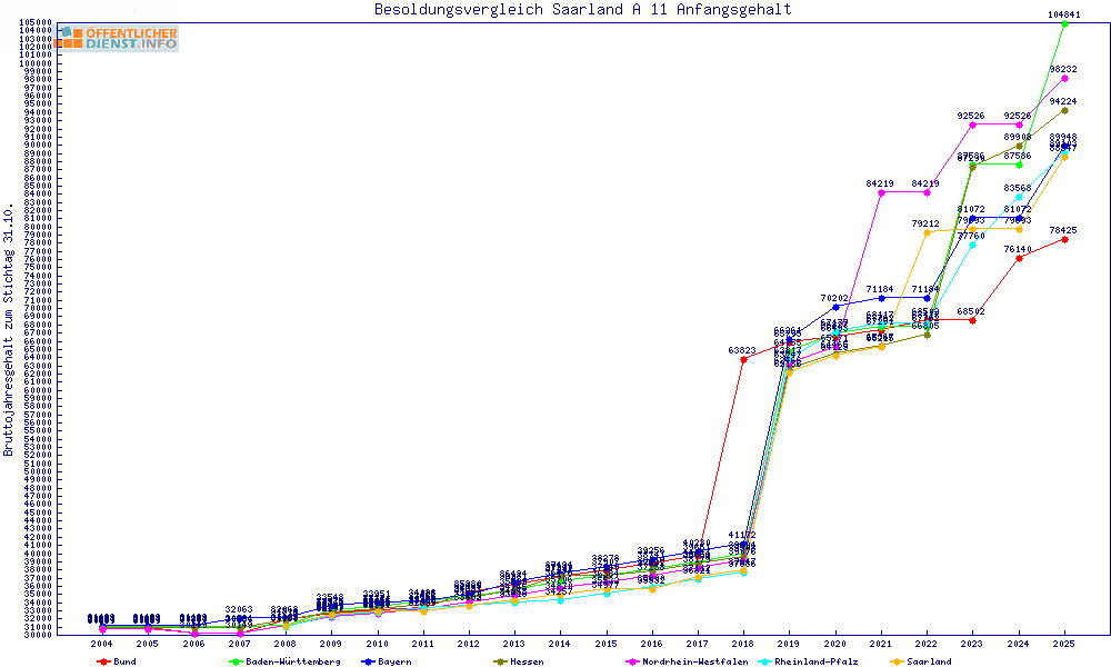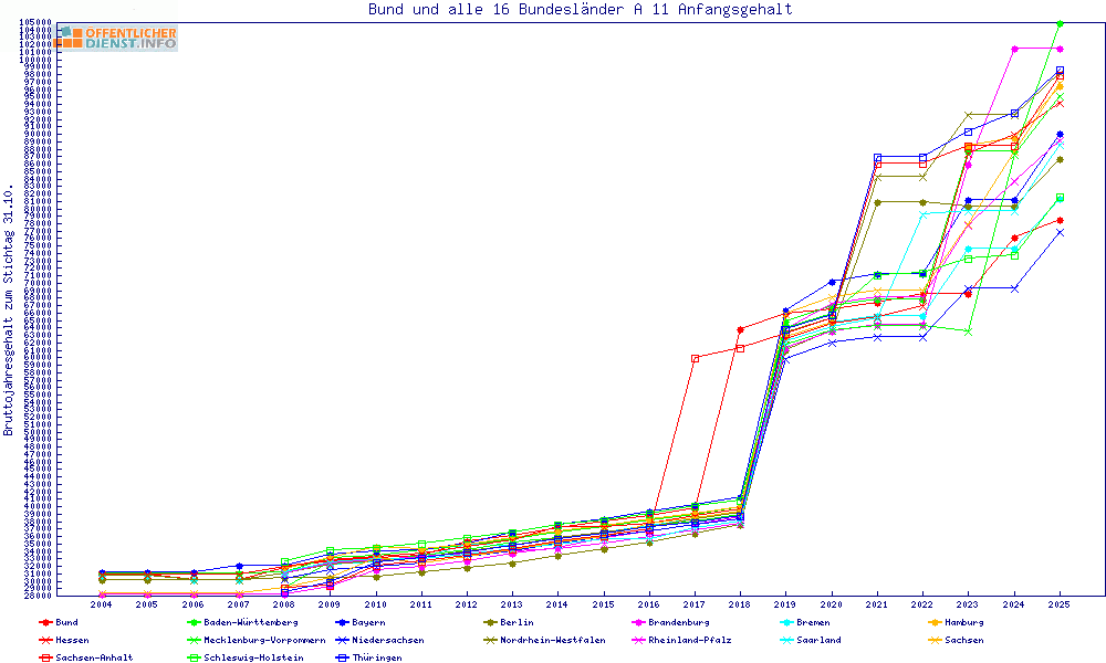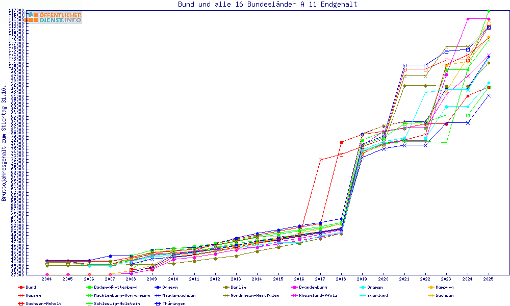 | Besoldungsvergleich A 11 im Jahr 2025 | Anfangsgehalt | ||||||