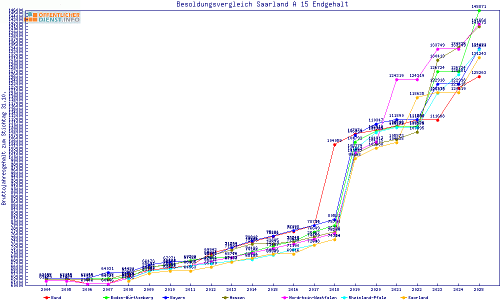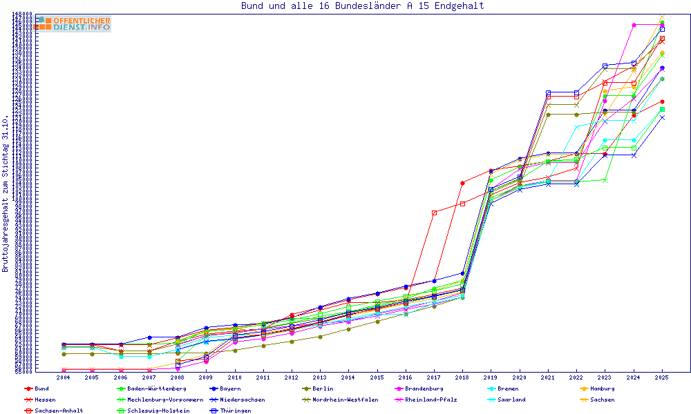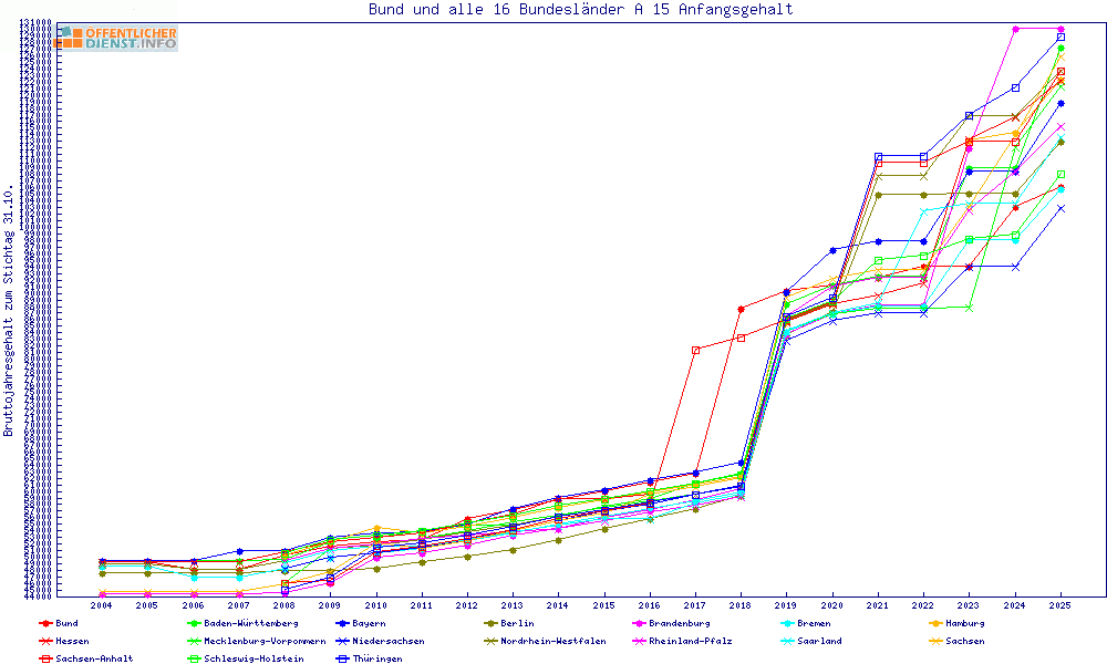 | Besoldungsvergleich A 15 im Jahr 2025 | Anfangsgehalt | ||||||