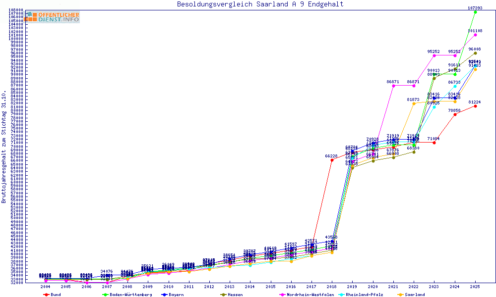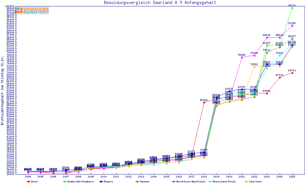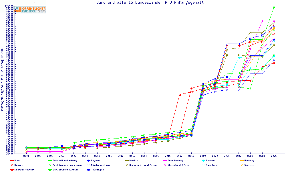 | Besoldungsvergleich A 9 im Jahr 2025 | Anfangsgehalt | ||||||