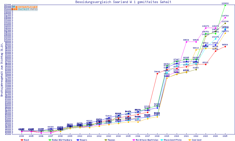 | Besoldungsvergleich W 1 im Jahr 2025 | gemitteltes Gehalt | ||||||